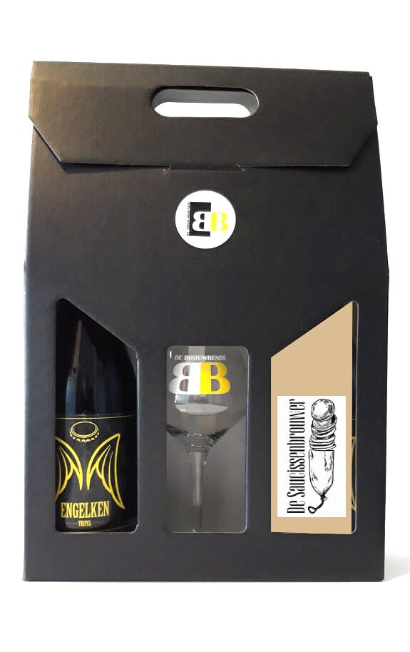 1 fles 75cl Engelken, een glas en een pakket vacuumverpakte saucissen van De Saucissenbrouwer. Een lekker geschenk in een stijlvolle verpakking.